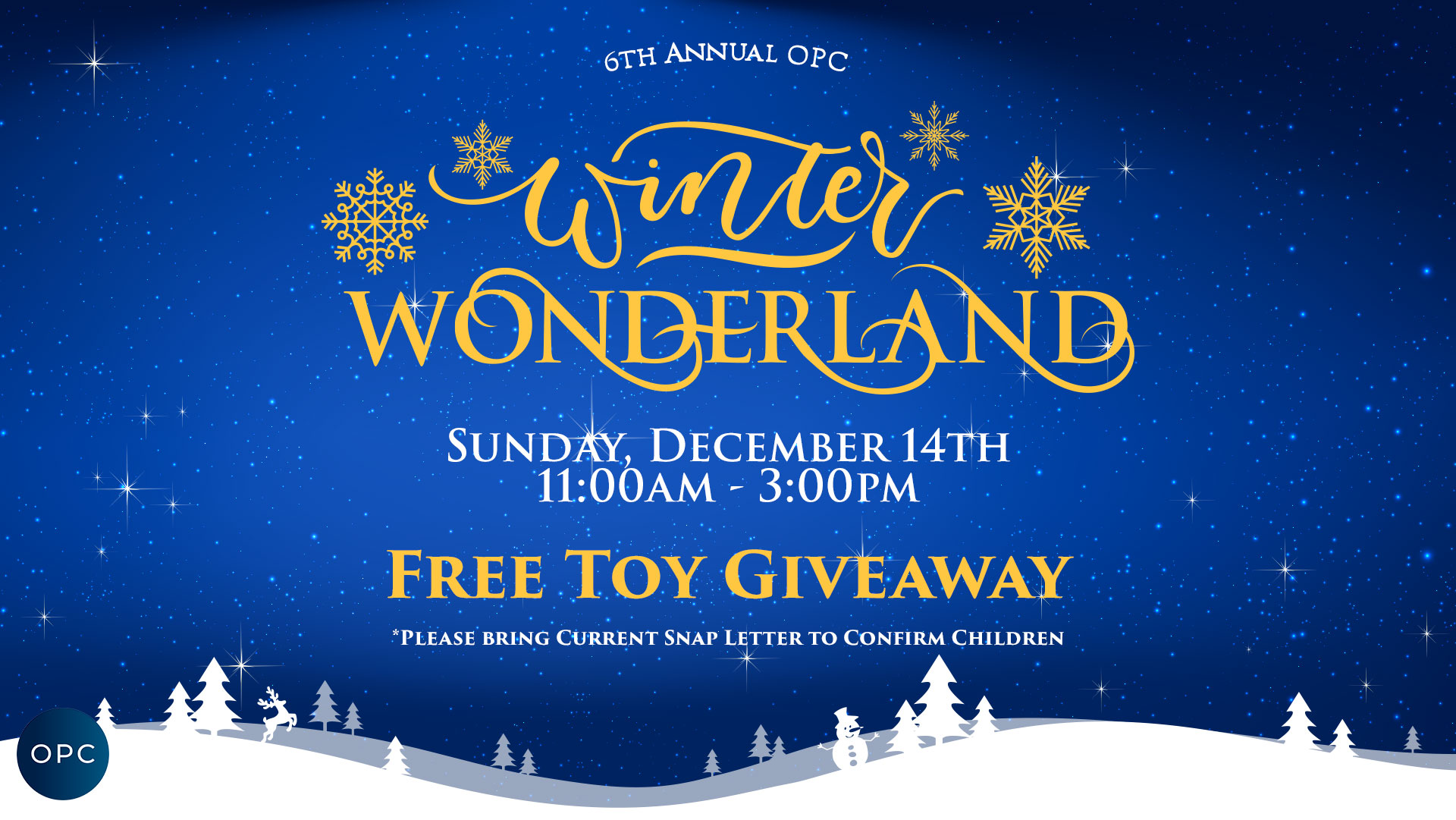 The Winter Wonderland Toy Giveaway will take place on Sunday, December 14th from 11 a.m.–3 p.m., and this year we will only be distributing toys for the children. Parents, please bring current SNAP letter to verify children.